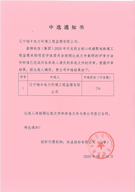 中標喜訊-盤錦電信(集團)2020年天龍藥業(yè)核心機樓配電新建工程