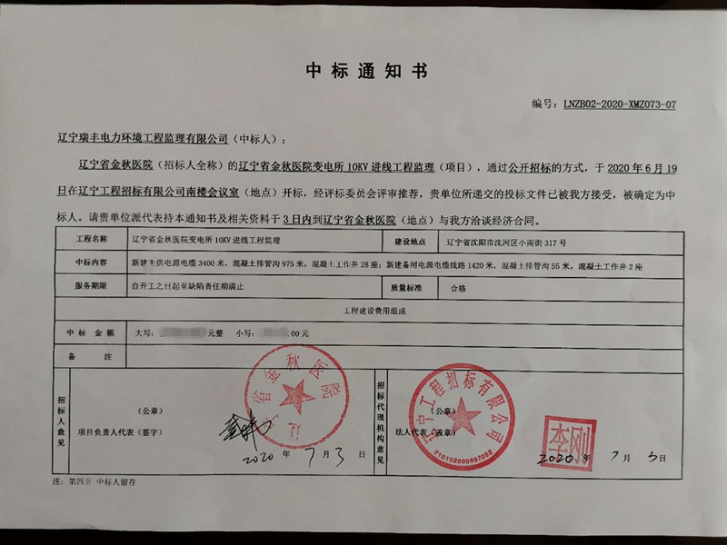 中標(biāo)喜訊-遼寧省金秋醫(yī)院變電所10kV進(jìn)線工程監(jiān)理