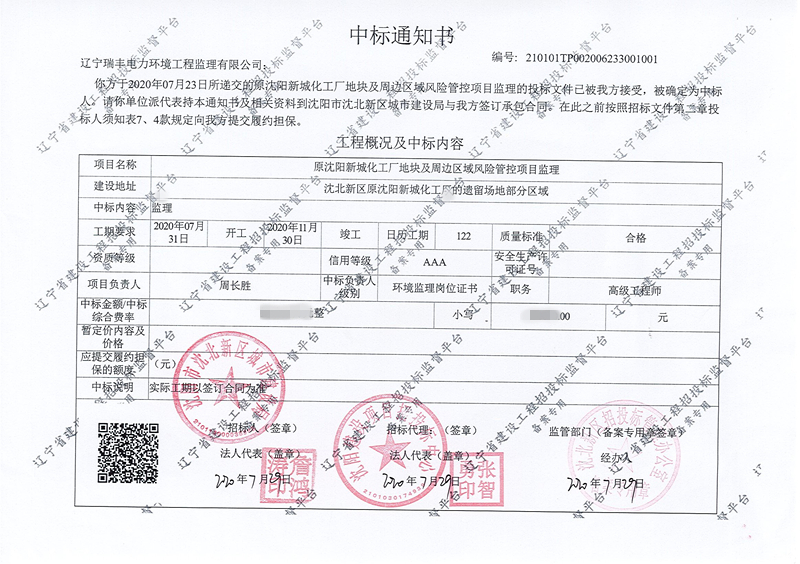 中標(biāo)喜訊-原沈陽(yáng)新城化工地塊及周邊區(qū)域風(fēng)險(xiǎn)管控項(xiàng)目監(jiān)理