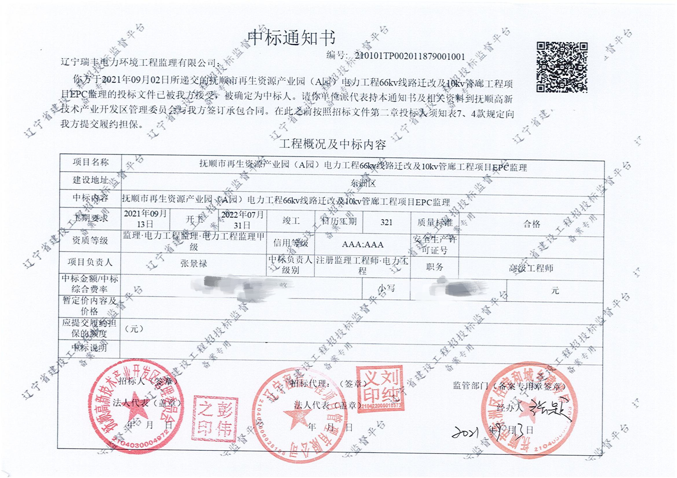 中標(biāo)喜訊-撫順市再生資源66KV線路遷改及10KV管廊工程