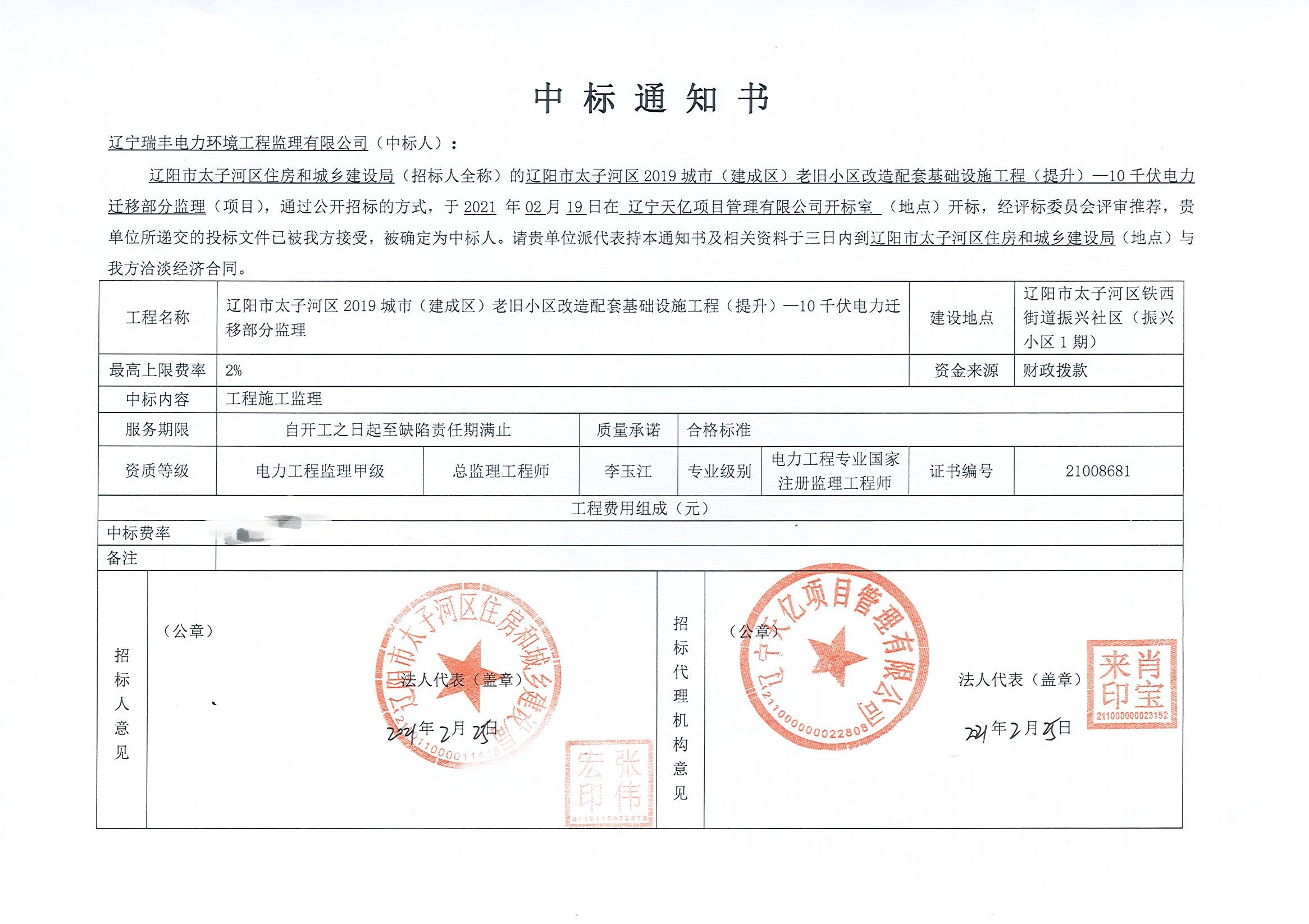 中標喜訊-遼陽市太子河區(qū)2019城市(建成區(qū))老舊小區(qū)改造配套基礎(chǔ)設(shè)施工程(提升)—10千伏電力遷移部分監(jiān)理