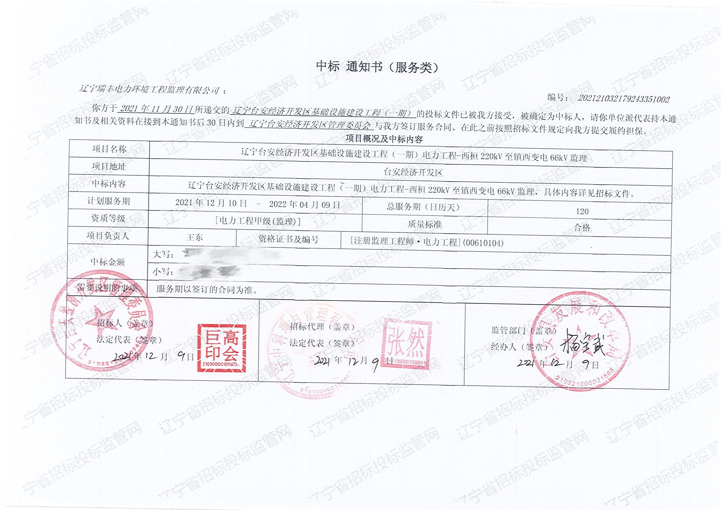 中標(biāo)喜訊-遼寧臺安經(jīng)濟(jì)開發(fā)區(qū)基礎(chǔ)設(shè)施建設(shè)工程(一期)電力工程-西桓220kV至鎮(zhèn)西變電66kV監(jiān)理