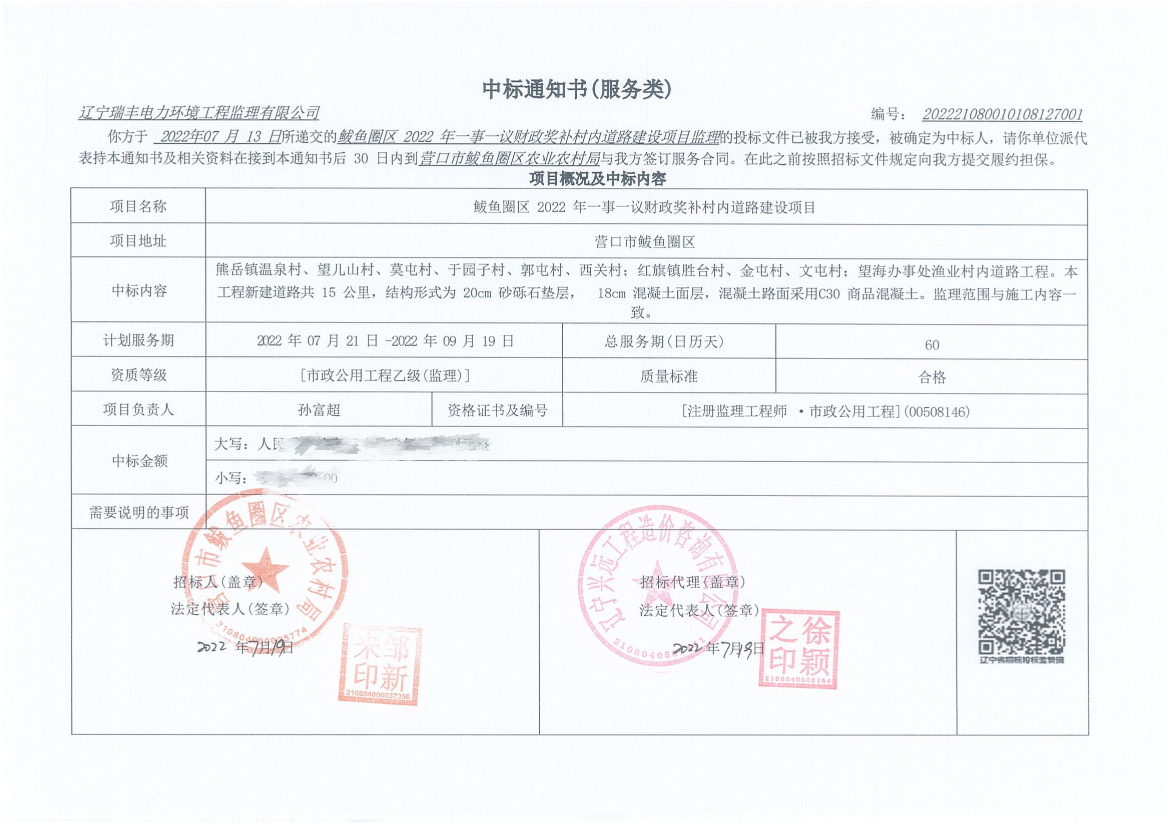 中標(biāo)喜訊-鲅魚圈區(qū)2022年一事一議財(cái)政獎(jiǎng)補(bǔ)村內(nèi)道路建設(shè)項(xiàng)目