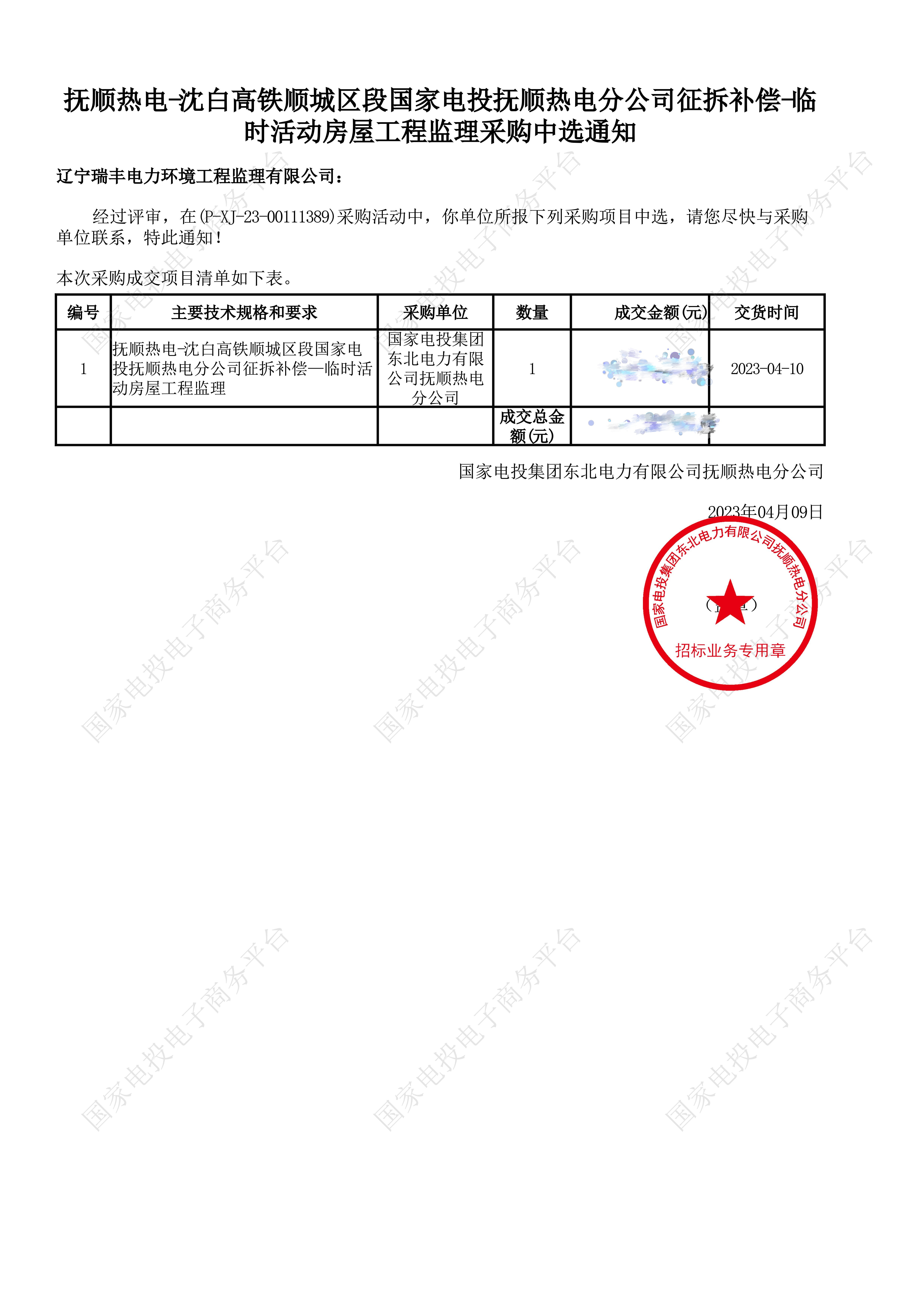中標(biāo)喜訊-撫順熱電-沈白高鐵順城區(qū)段國家電投撫順熱電分公司征拆補(bǔ)償-臨時活動房屋工程監(jiān)理