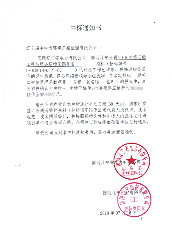 中標(biāo)喜訊-國(guó)網(wǎng)遼寧公司2018年第三批工程與服務(wù)-運(yùn)檢二框架監(jiān)理