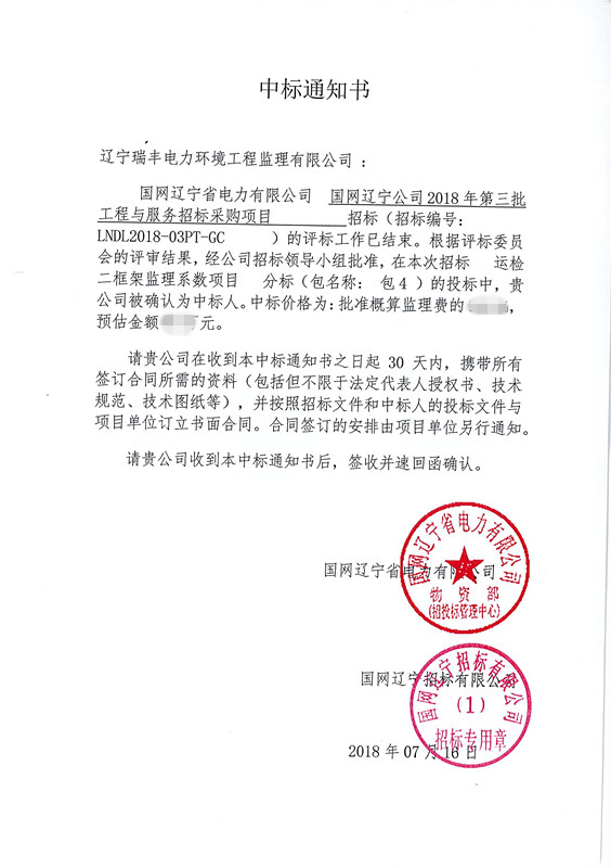 中標(biāo)喜訊-國(guó)網(wǎng)遼寧公司2018年第三批工程與服務(wù)-運(yùn)檢二框架監(jiān)理